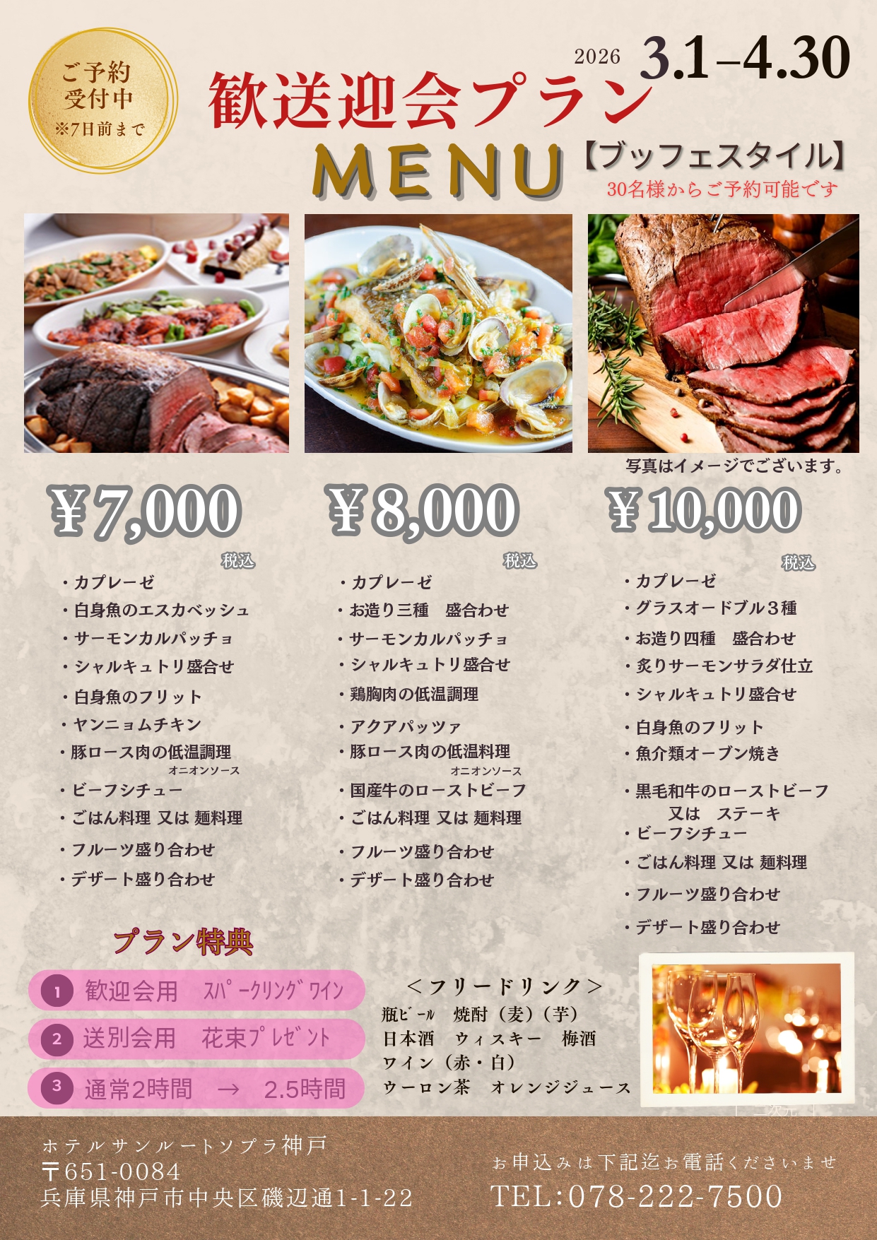 トピックスtopicsホーム » 歓送迎会プラン 新登場歓送迎会プラン 新登場2026.03.18大切な仲間の門出と、新しい出会いをお祝いする歓送迎会プランをご用意いたしました。会社のご宴会、仲間との集まりなど様々なシーンで是非ご利用ください。お気軽にお問い合わせください。↓詳細はコチラ↓https://www.sopra-kobe.com/banquet/index.html トピックス一覧アーカイブ2026年2025年2024年2023年
